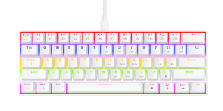 Compact 60% toetsenbord met 61 stille mechanische toetsen voor comfort tijdens lange gamesessies. Inclusief 12 multi-mediatoetsen en levendige regenboogverlichting. De afneembare 1,6 m USB-C-naar-USB-C-kabel zorgt voor flexibiliteit in elke setup.
